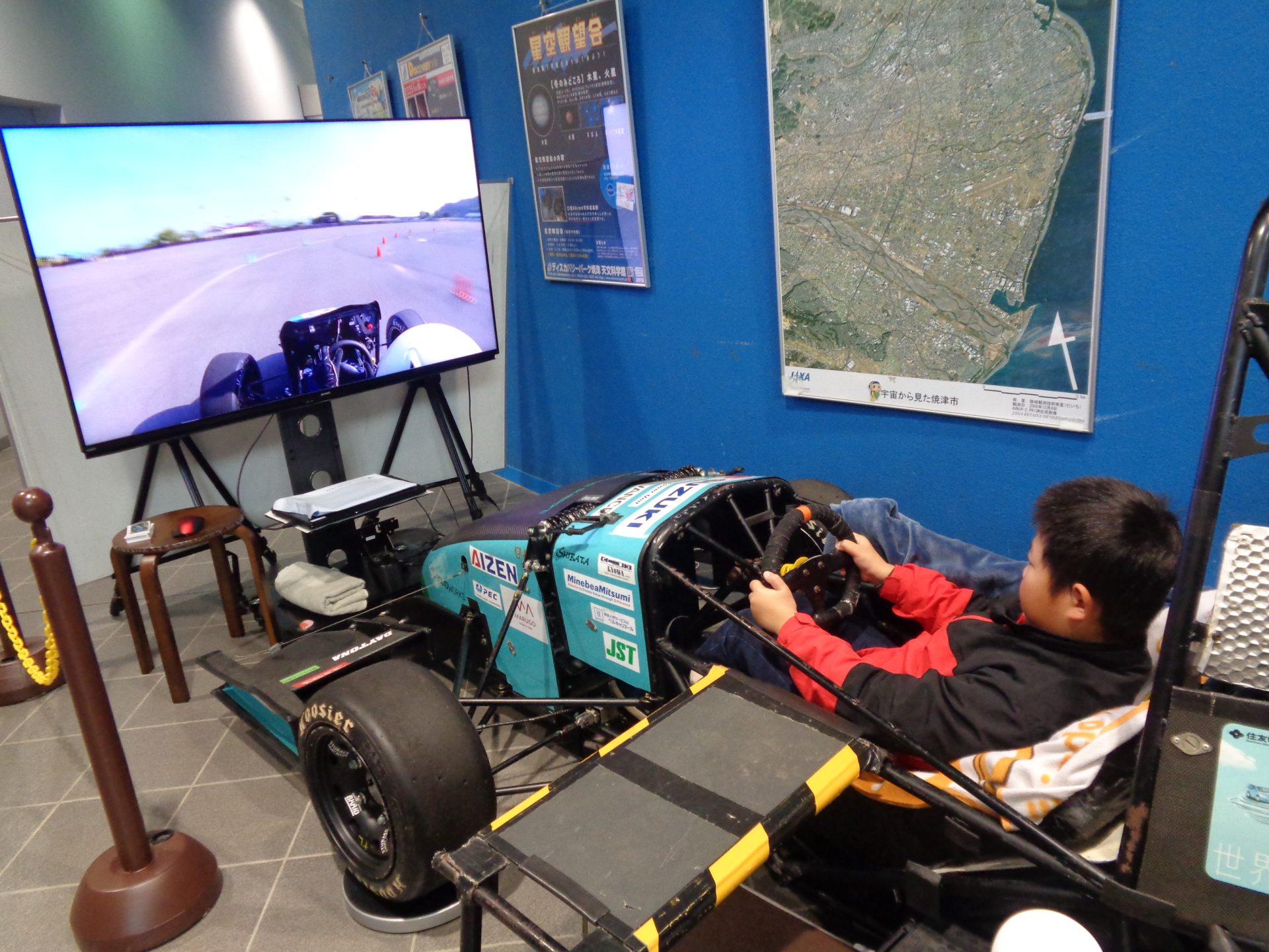 静岡理工科大学生が制作した「フォーミュラカー」に乗って、走行画面を見ながらハンドル操作をしてみよう!