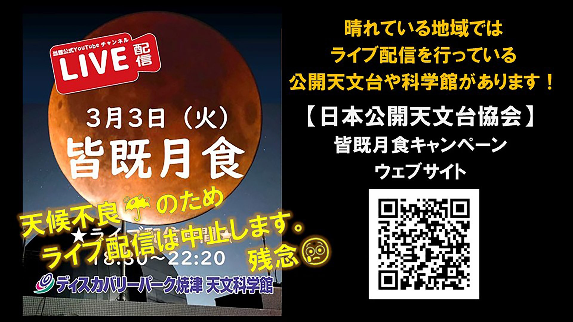 本日(3/3)の皆既月食ライブ配信は、天候不良のため中止します。