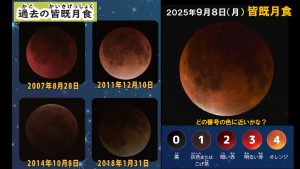 (4)皆既のときの月の色(全部欠ける「皆既」となったとき、月は見えなくなりません。赤黒い暗い月になります。ただ、このときの”赤さ”と”明るさ”は月食ごとに異なります。)