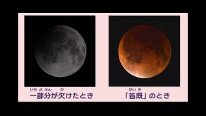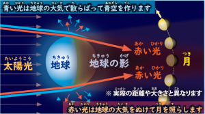 (3)月の欠け方(普段の月のかけ方とは異なります。月食の欠けた暗い部分には、丸い地球の影にあたります。)